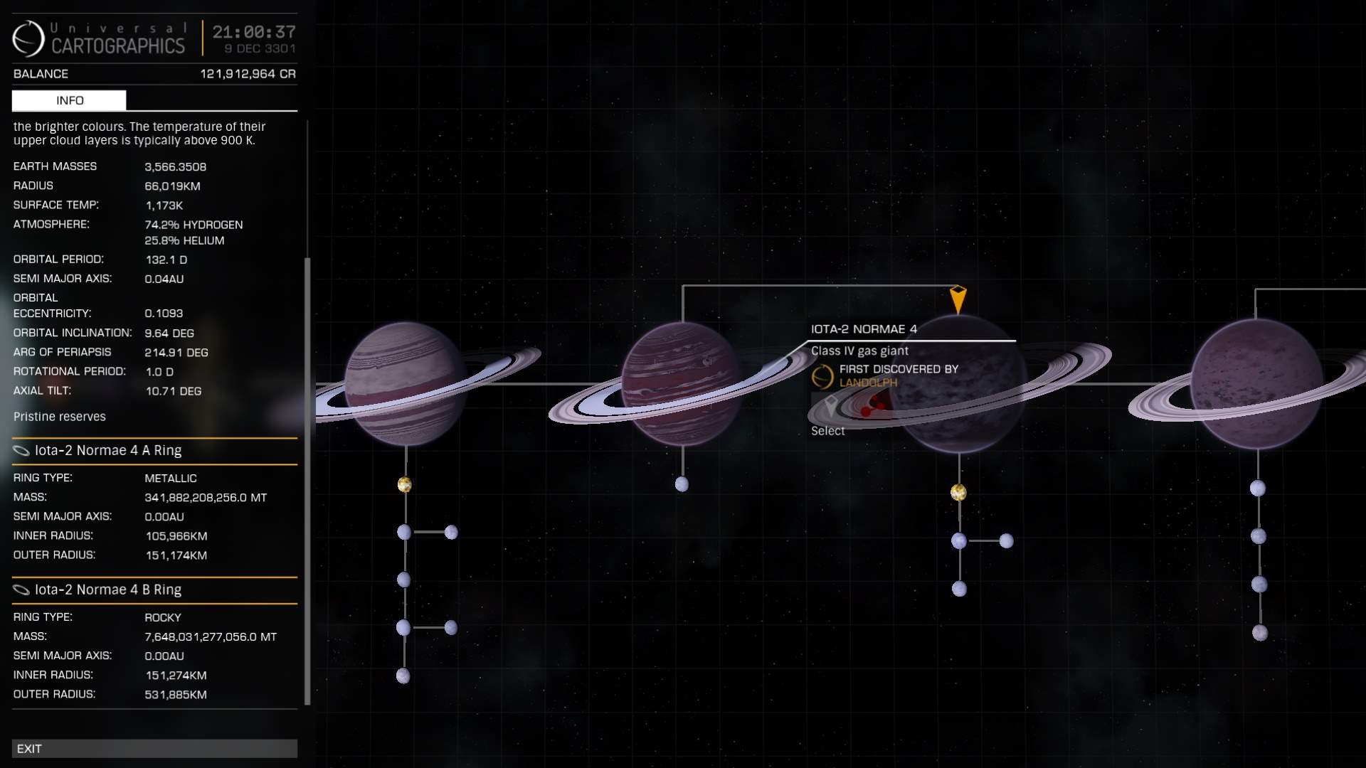 I have found many mining systems some not known in any other sources, I am most proud of LFT 65 as it is near the centre of the bubble (the closest to Sol that I know of). I found it whilst doing detailed surface scans on all the White Dwarves within the bubble (they are very common within the bubble). I will make a list and an explanation as to why they are a good source of income some other time. My favourite pristine metallic ring is in the Alkupai system where the ring is around a Tauri T star so it is always lit up
